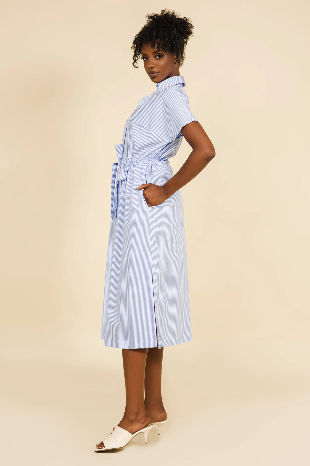 Az AMNESIA Trisz ruha egy klasszikus, nőies darab, amelyet ekrü-fekete kockás szövetből készítettünk el. A szabásvonalat az elegáns gallér és a végigfutó gombsor teszi különlegessé, míg a derékrészen található gumírozás szépen hangsúlyozza az alakot, miközben kényelmes viseletet biztosít. A háromnegyedes ujjak felgombolható kialakítása a praktikumot és a stílust ötvözi.