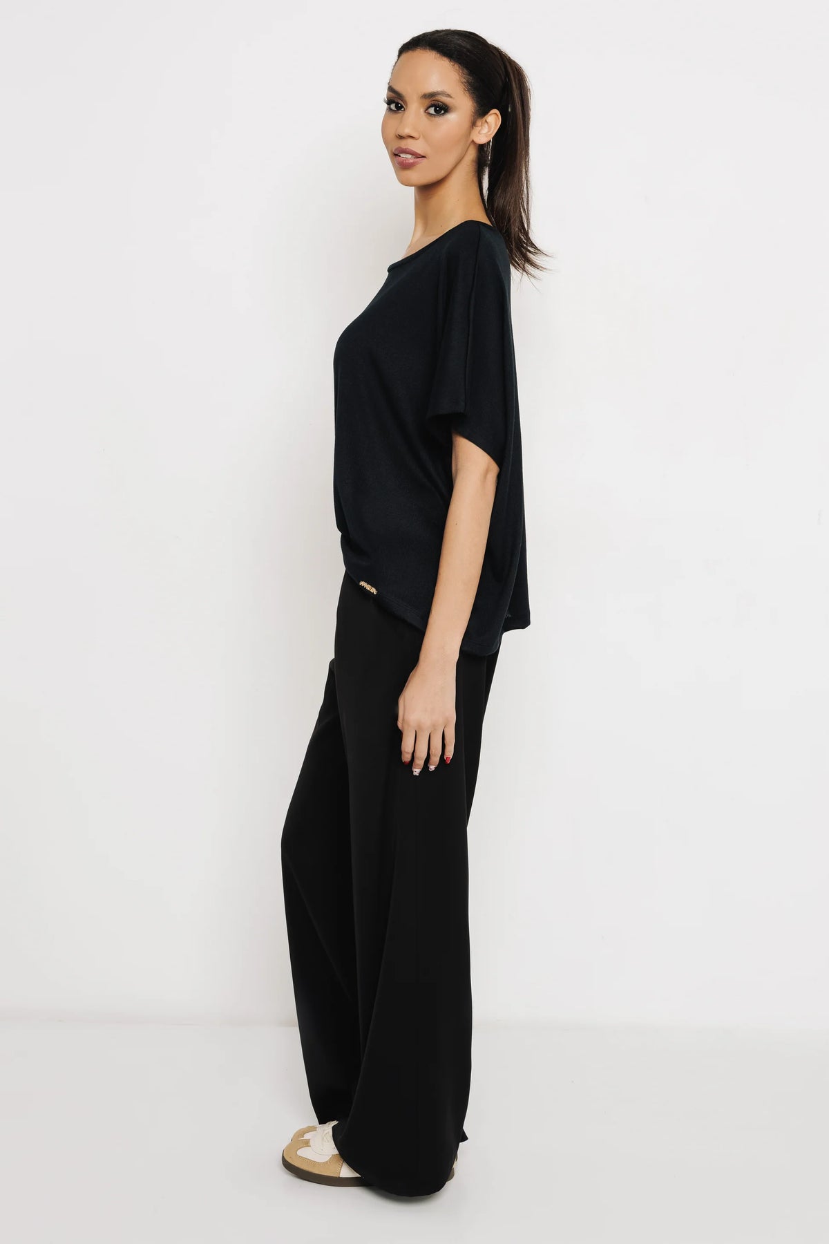 A modell magassága: 178 cm és S-es méretet visel. A modell méretei: mell - 86 cm, derék - 65 cm, csípő - 94 cm.
