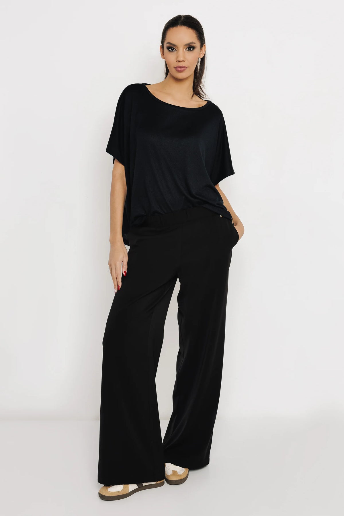 A műbőr a bőr elegáns hatását idézi meg, miközben állatbarát és modern alternatívát kínál. Tartós, könnyen tisztítható, és hosszú ideig megőrzi fényes felületét, formáját. A letisztult textúra különleges karaktert kölcsönöz a daraboknak, legyen szó zakóról, nadrágról vagy kiegészítőről.